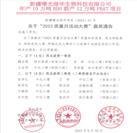2023年9月30日下午,业主新疆曙光绿华生物科技有限公司联合监理安徽万纬工程管理有限责任公司、总包东华工程科技股份有限公司及分包单位共同组织开展了“2023质量月活动大赛”。
