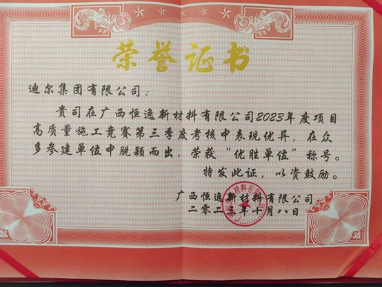 由迪尔集团有限公司第二公司承建的广西恒逸项目部,在2023年度项目高质量施工竞赛中表现优异,荣获“优胜单位”称号,受到了监理单位、建设单位的一致好评!