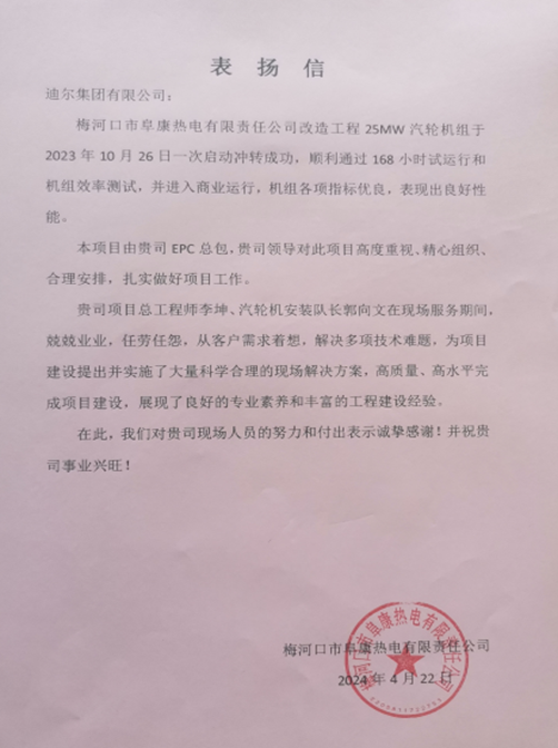 4月22日,梅河口市阜康热电有限责任公司对山东工程设计院负责设计、施工的梅河口市阜康热电4号汽轮机低碳节能技改EPC总承包项目给予高度肯定,并发来表扬信。