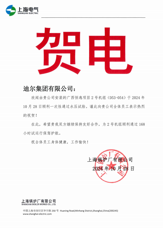 2024年10月28日15点22分,由迪尔集团第二公司承建的广西恒逸项目2#炉水压试验一次成功,为此,上海锅炉厂有限公司向项目部发来贺电,业主及监理给予一致好评。