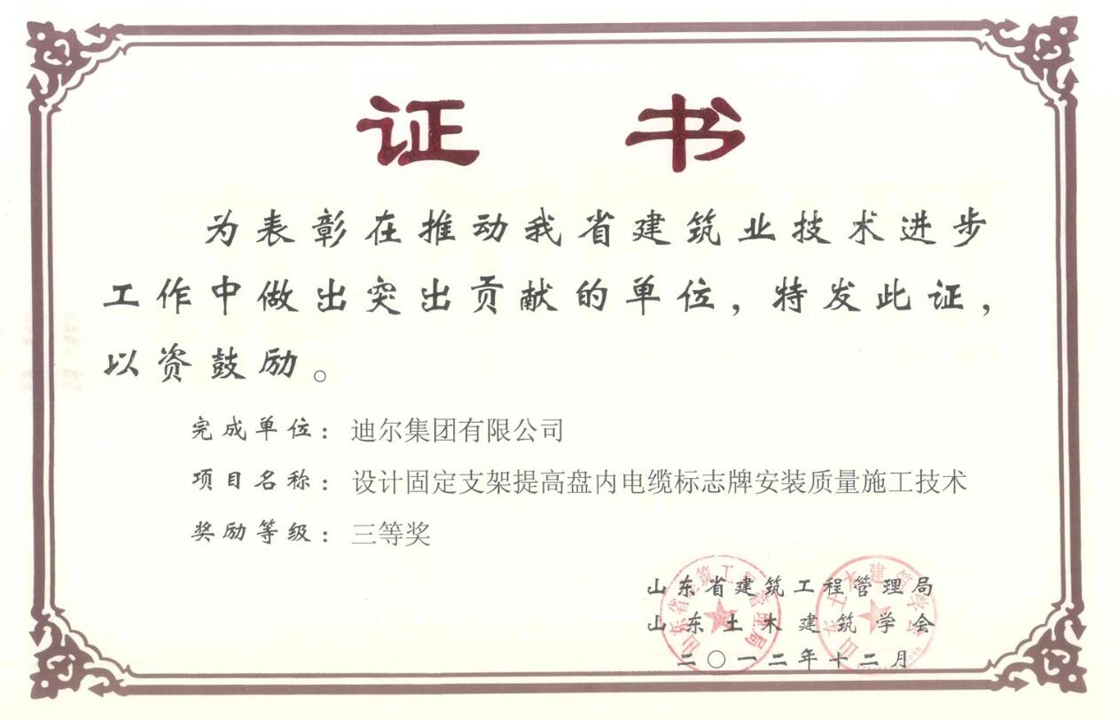 公司荣获山东省省级“设计固定支架提高盘内电缆标志牌安装质量施工技术”