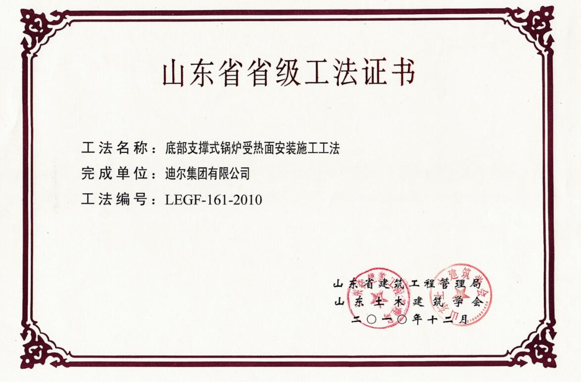 公司荣获山东省省级“底部支撑式锅炉受热面安装施工工法”