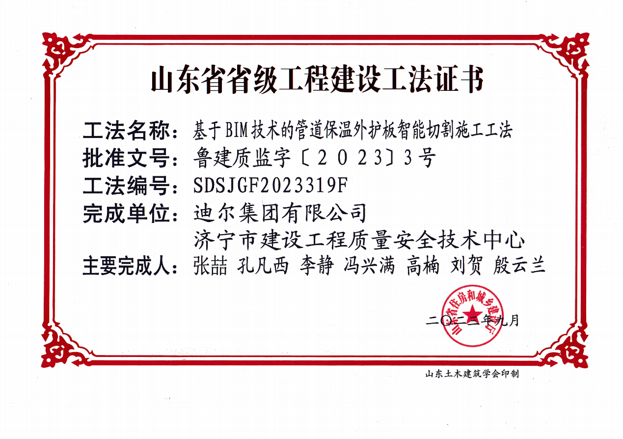 公司荣获《基于BIM技术的管道保温外护板智能切割施工工法》省级工法