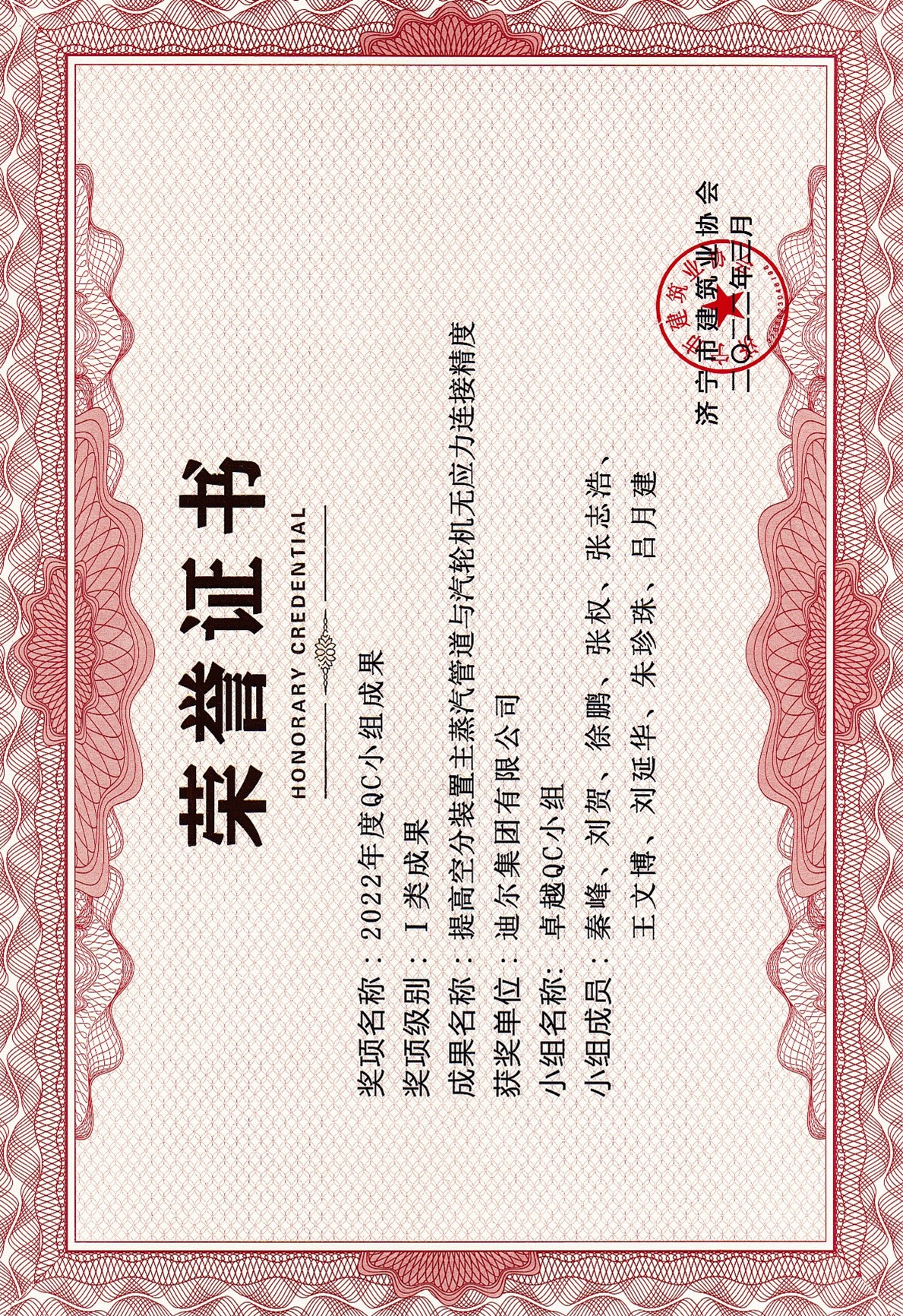 公司荣获2022年济宁市QC成果“提高空分装置主蒸汽管道与汽轮机无应力连接精度”