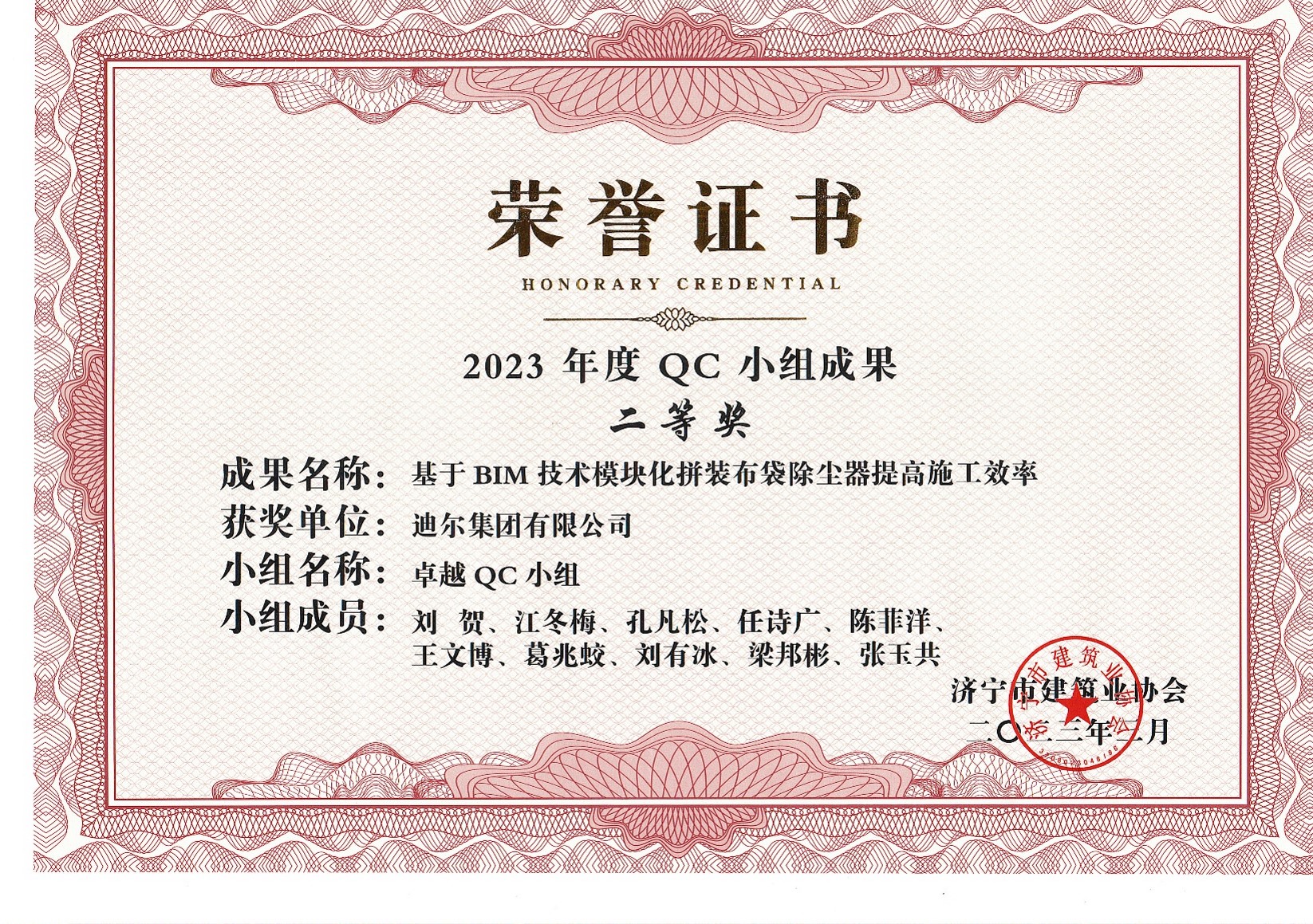 公司荣获2023年荣获市级QC成果基于 BIM 技术模块化拼装布袋除尘器提高施工效率