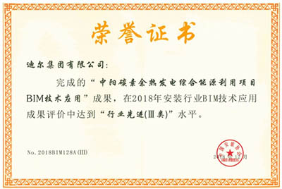 2018年12月,由中国安装协会BIM应用与智慧建造分会主办的2018年安装行业BIM技术应用成果交流会暨现场观摩会上,迪尔集团有限公司选送的“中阳碳素余热发电综合能源利用项目BIM技术应用”经过优选推荐、资料初审、专业审查、择优入围、现场发布、专家评分等层层选拔,从129个行业单位169项作品中脱颖而出,达到行业先进(Ⅲ类)水平。