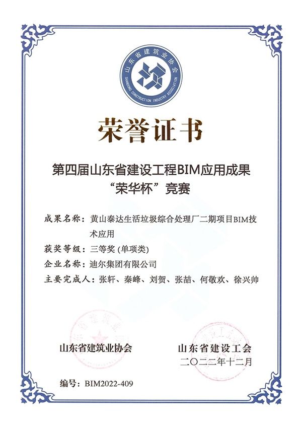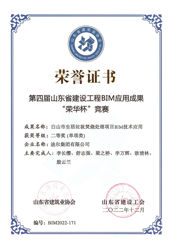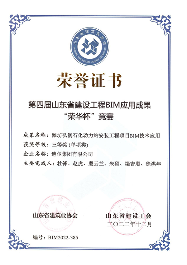 近日,由山东省建筑业协会、山东省建设工会联合主办的第四届山东省建设工程BIM应用成果“荣华杯”竞赛结果评奖揭晓,迪尔集团有限公司经专家评审、终评答辩和公示等环节,最终获得二等奖2项、三等奖2项的优异成绩