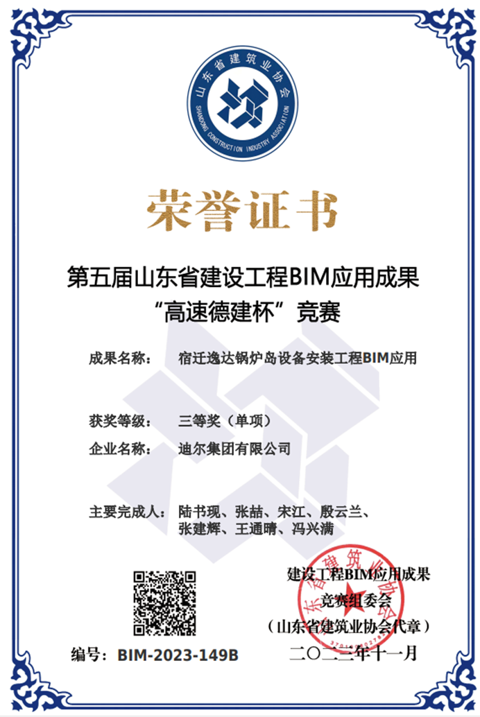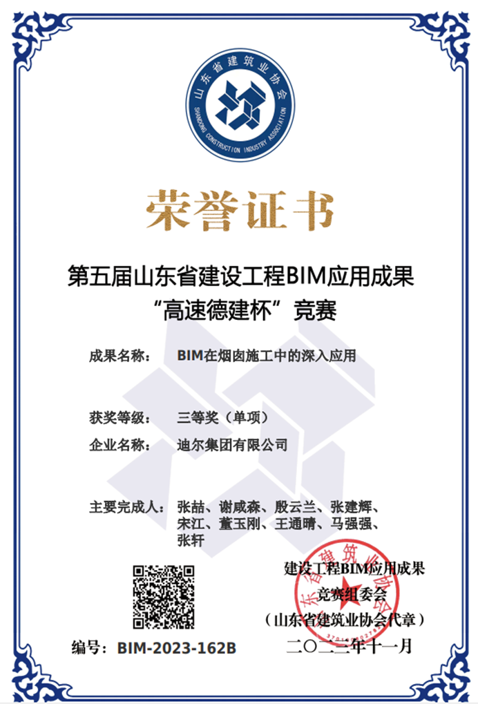 由山东省建筑业协会、山东省建设工会联合主办的第五届山东省建设工程BIM应用成果“高速德建杯”竞赛结果评奖揭晓,迪尔集团有限公司经专家评审、终评答辩和公示等环节,最终获得三等奖3项。