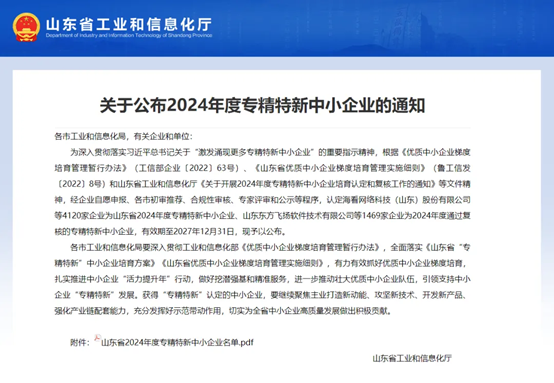 近日,山东省工业和信息化厅公布2024年度专精特新中小企业,山东迪尔节能科技有限公司顺利通过评审认定。